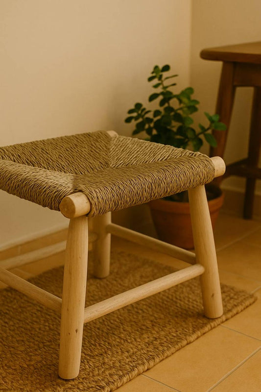 Handwoven Natural Cord Stool – Rustic Wood Frame