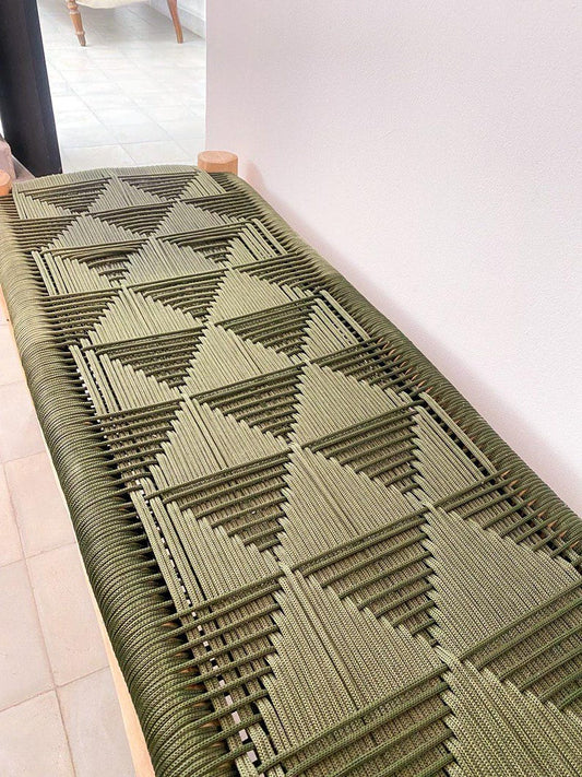 Handwoven Green Cord Bench – Rustic Natural Wood Frame