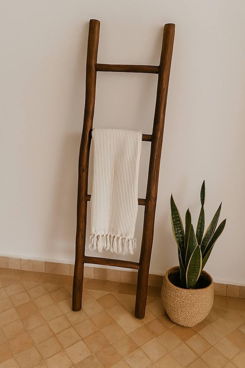 Add a warm and elegant touch to your décor with this natural brown wooden ladder. Perfect as a towel rack in the bathroom or as a stand for throws and textiles in the living room, it blends beautifully into bohemian, rustic, or natural interiors.