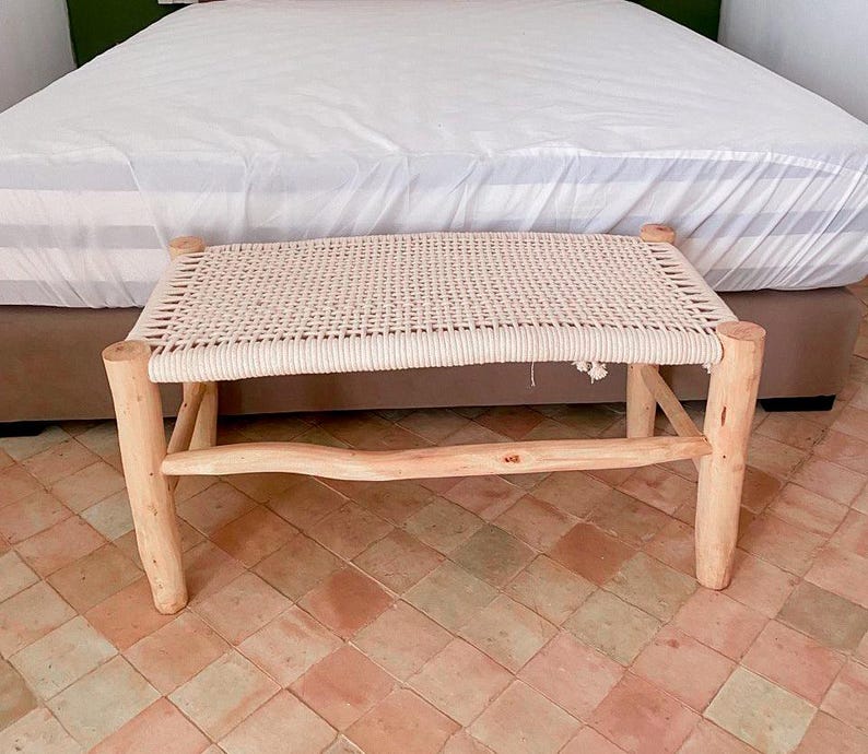 Bring authentic Moroccan craftsmanship into your home with this handwoven bench, crafted from solid natural wood and cotton cord. Its minimalist design blends rustic charm with modern elegance, making it a versatile piece for any room.